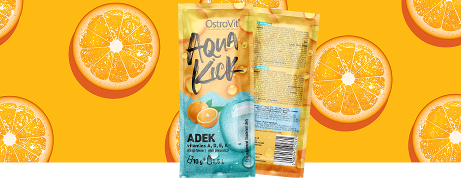 OstroVit Aqua Kick ADEK - це дієтична добавка, яка є джерелом жиророзчинних вітамінів, таких як вітамін А, вітамін D та вітаміни Е і К. Це сучасний препарат з унікальним апельсиновим смаком, який випускається у зручній формі саше. Це продукт, розроблений для фізично активних людей, який забезпечує безперебійне постачання цінних мікроелементів.