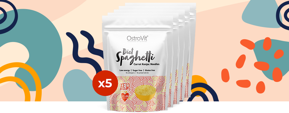OstroVit Diet Spaghetti Carrot Konjac Noodles - це низькокалорійний еквівалент класичної локшини спагетті. Продукт виготовляється з борошна коньяку та морквяного порошку. Паста повністю безглютенова і не містить доданого цукру в інгредієнтах. Характеризується низьким глікемічним індексом і низьким вмістом жиру. Шукаєте смачну альтернативу класичним пшеничним макаронам? Обов'язково протестуйте локшину OstroVit Diet Spaghetti Carrot Konjac Spaghetti!
