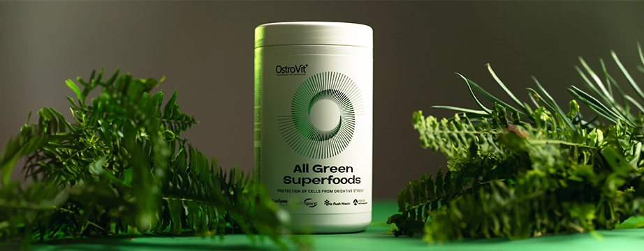 OstroVit All Green Superfoods - це комплексна дієтична добавка, яка містить безліч цінних інгредієнтів. Формула є джерелом рослинних екстрактів, грибів, вітамінів і мінералів, а також олії MCT і харчових волокон. Це цінний продукт, створений для свідомих споживачів, які хочуть доповнити свій щоденний раціон цінними інгредієнтами.