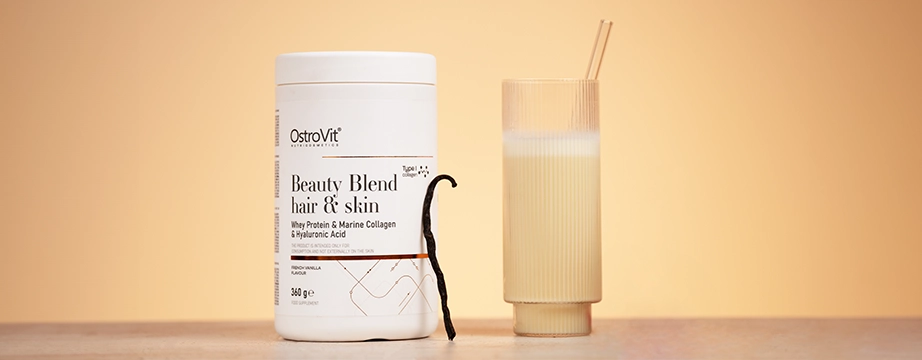 OstroVit Beauty Blend Hair & Skin - це комплексна дієтична добавка, яка є джерелом білка, а також містить колаген, гіалуронову кислоту, вітамін С, вітамін А, цинк і біотин. Це препарат з чудовим ванільним смаком, доступний у зручній формі порошку. Це продукт без додавання цукру, який чудово підходить для доповнення раціону людей, які хочуть виглядати здоровими та красивими.